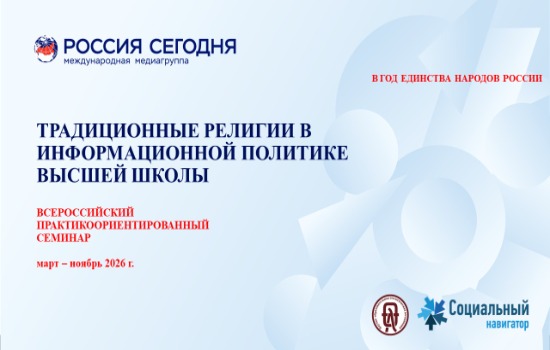 «Социальный навигатор» медиагруппы «РОССИЯ СЕГОДНЯ» в целях повышения медиаграмотности и развития профессиональных компетенций по религиозной журналистике по благословению епископа Сергиево-Посадского и Дмитровского Кирилла, президента Научно-образовательной теологической ассоциации, в рамках Года народного единства анонсирует старт второго всероссийского практикоориентированного семинара «Традиционные религии в информационной политике высшей школы».