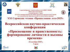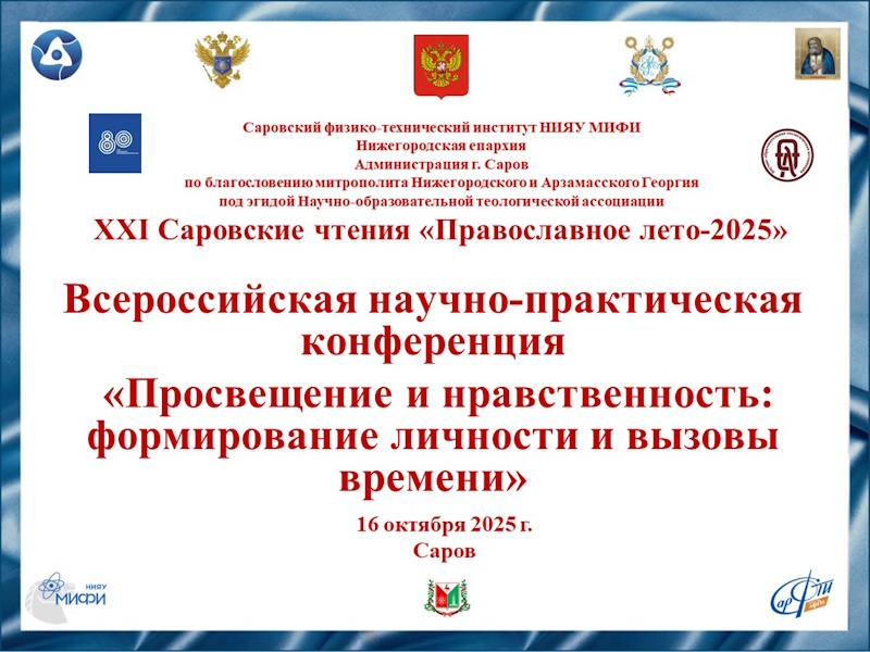 В Сарове прошли ХХI Саровские чтения «Православное лето - 2025». Чтения организованы кафедрой теологии СарФТИ, Саровским Свято-Успенским монастырем - Саровская пустынь, Саровским благочинием, администрацией города в рамках муниципальной программы «Саров Благословенный». В рамках чтений прошли студенческий фестиваль и Всероссийская онлайн-конференция. Всего в Саровских чтениях приняло участие около 200 чел.