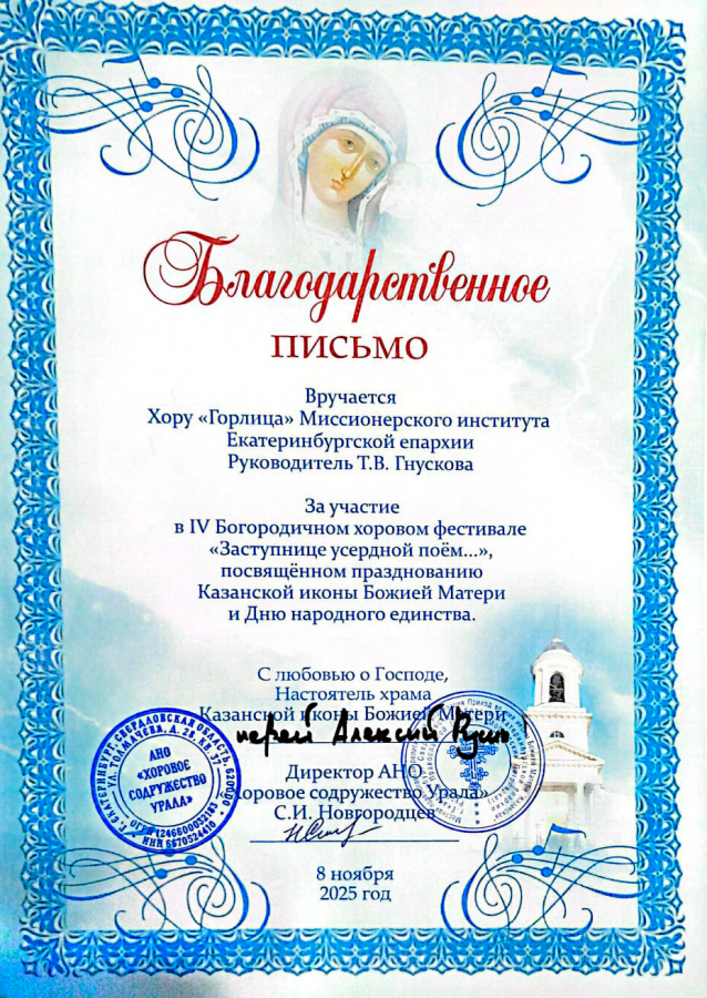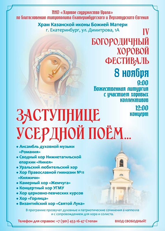 По благословению митрополита Екатеринбургского и Верхотурского Евгения фестиваль прошёл 8 ноября в храме Казанской иконы Божией Матери.
