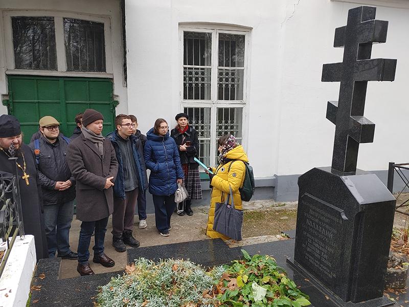 В продолжение проекта его участники посетили некрополь при Свято-Иоанно-Крестительском храме г. Орла, поучаствовав в интерактивной экскурсии «Незабытые имена: в память об орловском духовенстве». Студенты и преподаватели познакомились с историей возникновения некрополя, узнали о почитаемых храмовых святынях – Балыкинской иконе Божией Матери, иконе Божьей Матери «Всех скорбящих Радость», веригах свт. Тихона Задонского. Но основное внимание было уделено погребенным здесь священникам - протоиерею Иоанну Кореневу и митрополиту Палладию (Шерстенникову), а также Афанасию Андреевичу Сайко, почитаемому среди орловчан как Христа ради юродивый. Несмотря на разницу исторических эпох и служений, их объединял евангельский идеал любви к ближнему, ставший руководящим принципом их жизни.