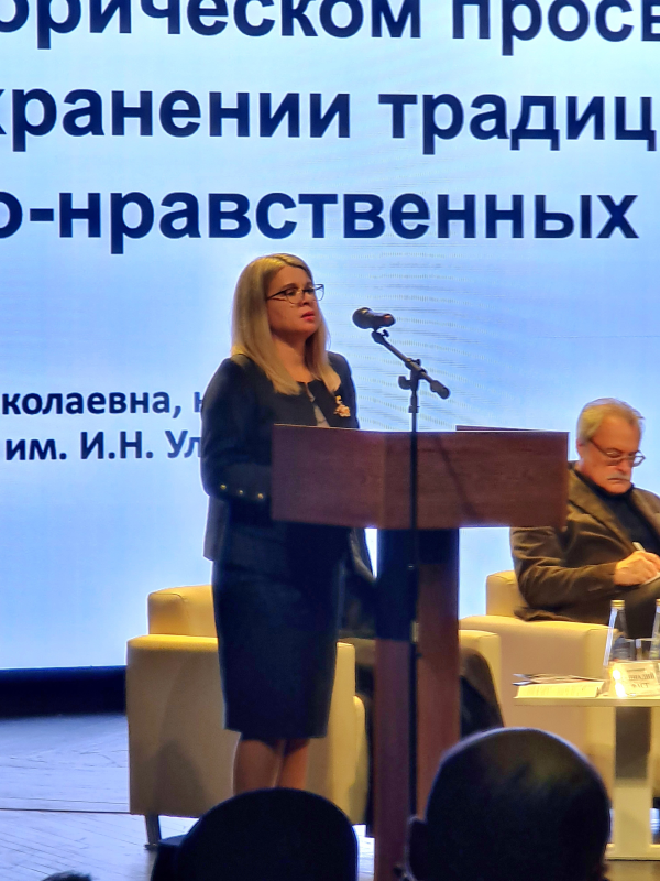 С ключевым докладом «О роли образовательных организаций в историческом просвещении и сохранении традиционных духовно-нравственных ценностей» выступила Елена Папуша, проректор по воспитательной работе и молодежной политике УлГПУ им. И.Н. Ульянова. Она представила системный подход университета, выделив три уровня вовлечения студентов.