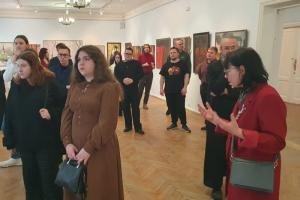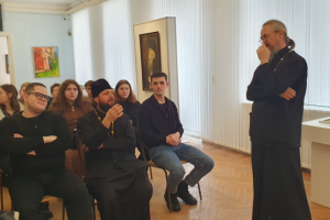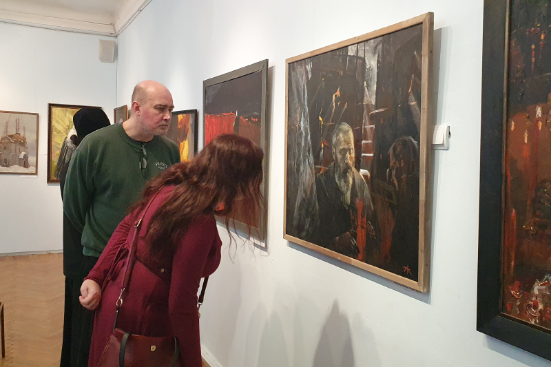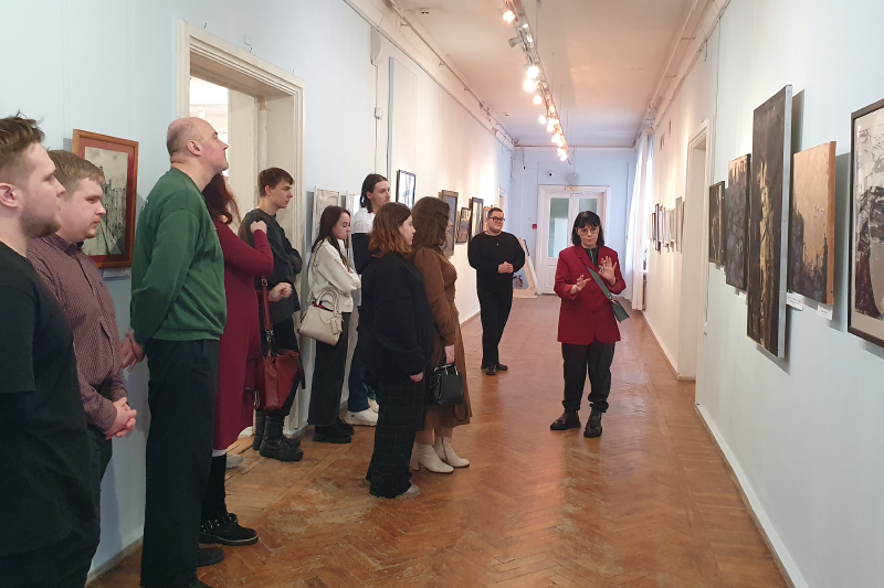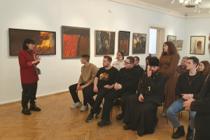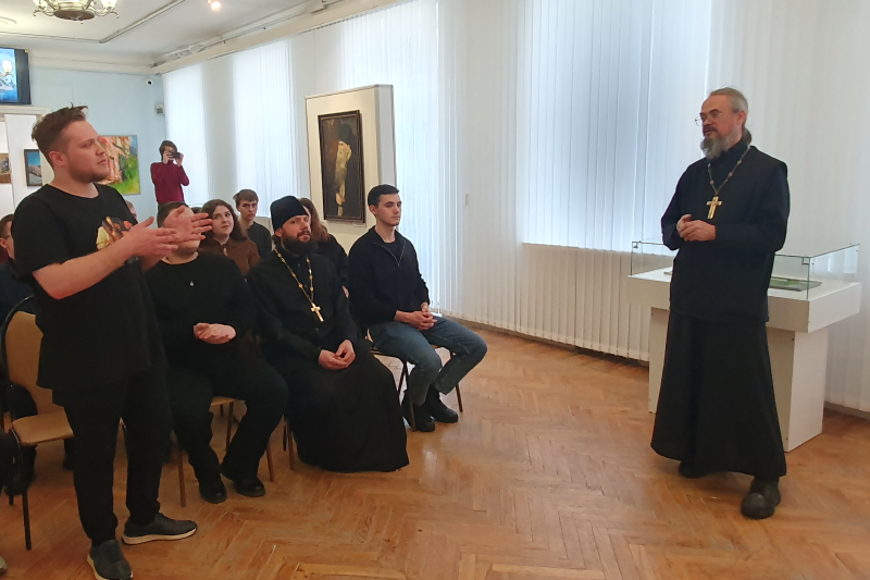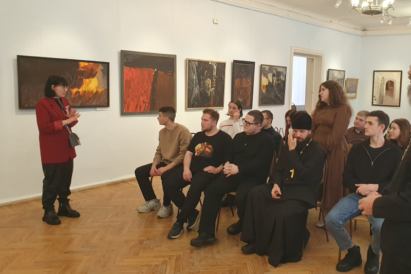 Тематика выставки заставила студентов задуматься о причинах, побудивших автора к созданию представленных картин (Демидова В., 2 курс бакалавриата), и о возможностях искусства как средства утверждения духовно-нравственных ценностей (Агафонов К., 4 курс бакалавриата). Впечатлило студентов построение экспозиции на контрасте (Власов А., 2 курс магистратуры): военные сюжеты, отражающие разрушение гармонии и естественного хода жизни, соседствуют с сюжетами мирной жизни. Автор, как художник и православный священник, здесь делает намёк на Божие присутствие. Оно угадывается в лучах солнца, пробивающихся сквозь тучи в ряде пейзажей и сюжетных картин на военную тему. И это даёт ощущение невероятной внутренней силы и надежды на будущее. Студенты правильно уловили глубинные причины войн. Так, например, Артемчик А. (1 курс магистратуры) отметил, что автор картин рассматривает войну с религиозно-нравственных позиций и видит в ней своеобразный духовный недуг человеческой жизни. Современный человек, не имеющий религиозно-нравственного стержня, впадает в состояние тяжелейшего духовного кризиса. Утратив веру, человечество оказывается в безнравственном тупике, разрушая мир.