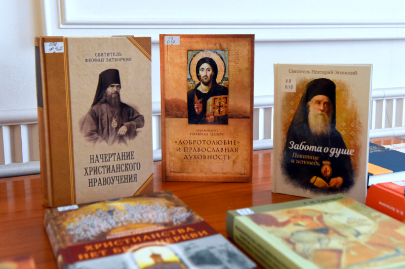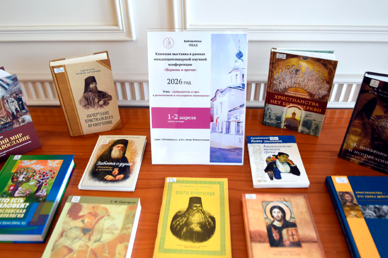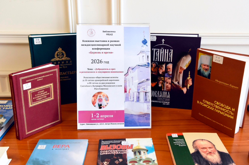 1 апреля 2026 года в Общецерковной аспирантуре и докторантуре им. святых равноапостольных Кирилла и Мефодия открылась книжная выставка, приуроченная к проведению Четвёртой междисциплинарной научной конференции «Церковь и время». Тема конференции этого года – «Добродетель и грех в религиозном и секулярном понимании». Представленные на выставке издания освещают аспекты этой проблематики сквозь призму евангельского и святоотеческого учения, канонической мысли, а также религиозного философского дискурса.